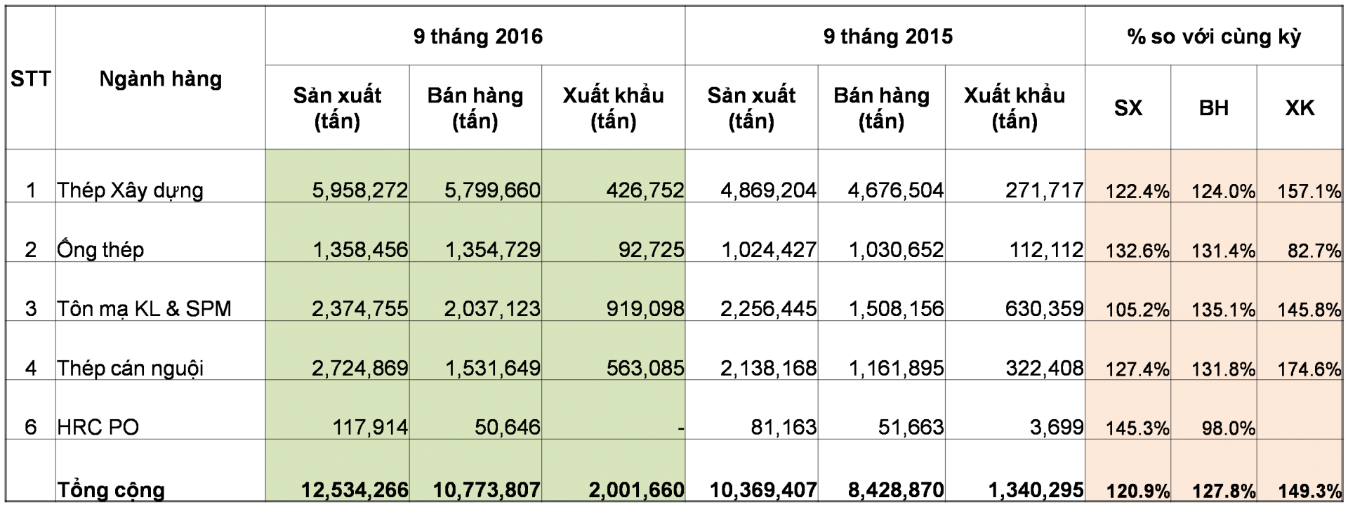 Trái với tình hình thị trường thép xây dựng được đánh giá là khá u ám trong giai đoạn từ năm 2015 đến nay, thị trường thép xây dựng quý I năm 2016 có những khởi sắc cả về sản lượng tiêu thụ cũng như về giá cả. Theo thống kê sơ bộ, tháng 9 năm 2016, sản xuất các sản phẩm thép của các doanh nghiệp thành viên VSA đạt 1.5 triệu tấn, tăng 18.6% so với cùng kỳ năm 2015, nhưng giảm 2.37 so với tháng trước. Bán hàng sản phẩm thép các loại tháng 9/2016 đạt 1.2 triệu tấn, giảm 6.05% so với tháng 8/2016, nhưng tăng cao so với cùng kỳ 2015 là 23.6%. Xuất khẩu sản phẩm thép các loại đạt 232,396 tấn, tăng 49% so với cùng kỳ năm trước, nhưng giảm 13.9% so với tháng trước.