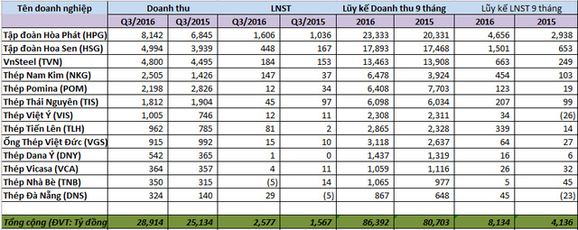 Xét về lợi nhuận thu được trong 9 tháng đầu năm 2016, hầu hết các doanh nghiệp thép năm nay đều tăng trưởng so với cùng kỳ năm ngoái. Những doanh nghiệp kinh doanh đa ngành hơn như Hòa Phát hay Hoa Sen đều báo lãi lớn. 9 tháng đầu năm 2016, Hòa Phát lãi sau thuế 4,656 tỷ đồng, tăng 58% so với cùng kỳ. Tập đoàn Hoa Sen cũng lãi lũy kế hơn 1,500 tỷ đồng, gấp 2.3 lần cùng kỳ năm 2015.
